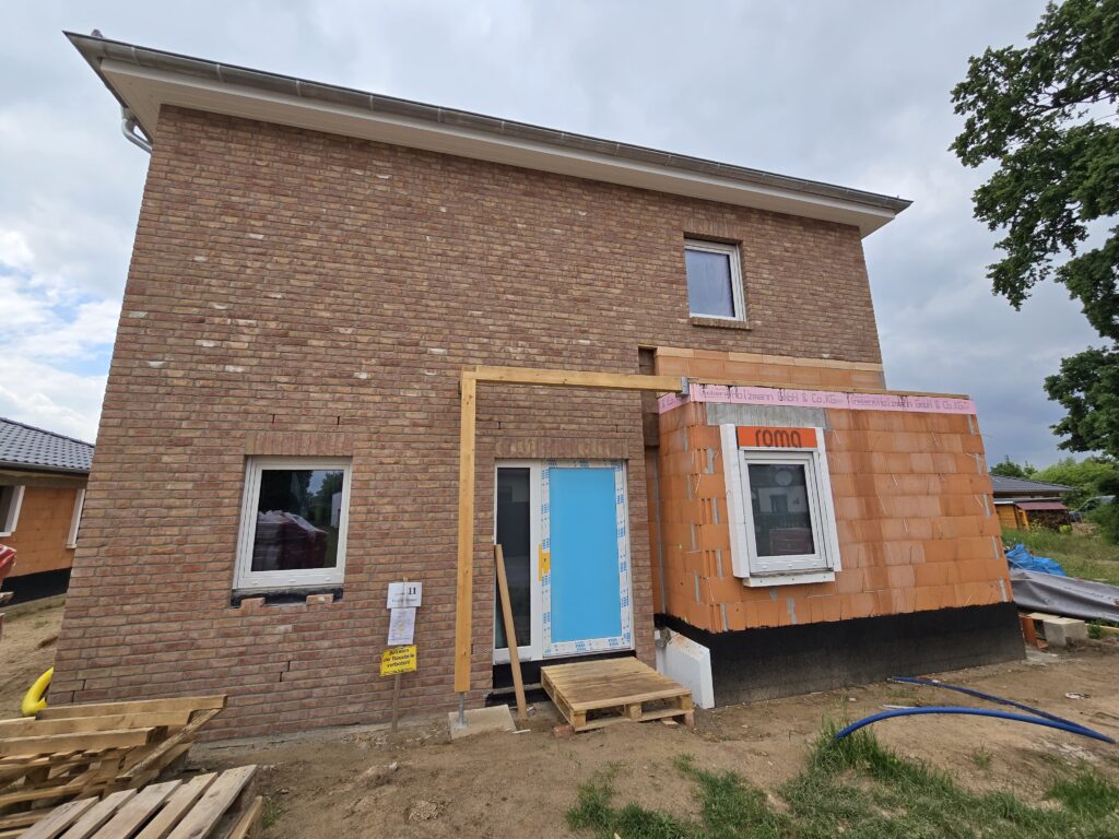 Am selben Tag besichtigten wir noch eine Baustelle von Klinkerhaus. Interessanterweise gefiel uns der dort verwendete Klinkerstein sehr gut – bei unserem Besuch im Ausstellungsraum von Steinzentrale selbst war er uns gar nicht direkt aufgefallen. Erst an der realen Fassade des fertigen Hauses konnten wir die Wirkung des Steins richtig einschätzen und waren von der Optik überzeugt.
