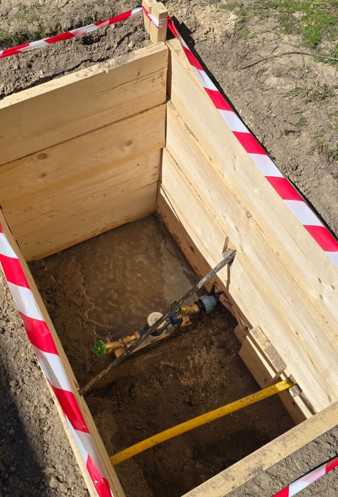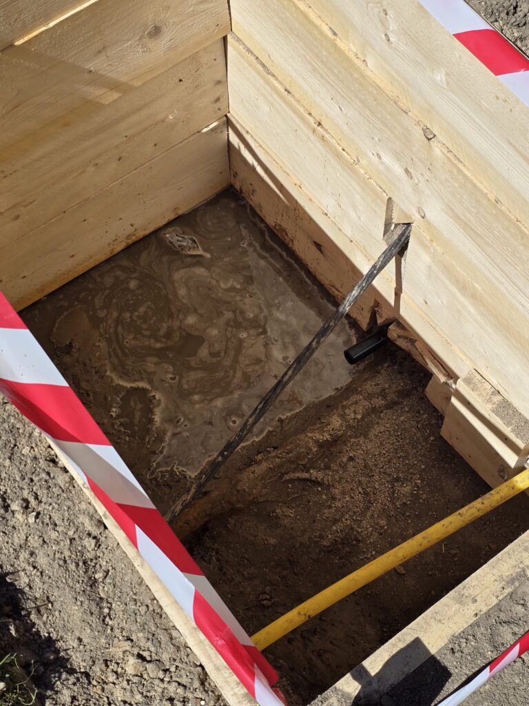 Bei der Vorabbesichtigung am Freitag wurde uns mitgeteilt, dass die Grube 1 × 1 Meter groß sein und der Wasseranschluss in etwa 1,20 Meter Tiefe liegen sollte. Anschließend wollten wir die Grube wie geplant absichern und versteifen.