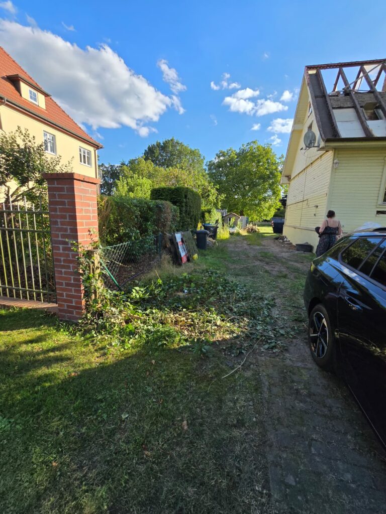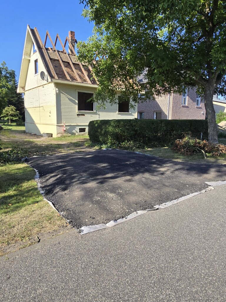 Zusätzlich zum angefangenen Abriss wurde die Baustellenüberfahrt erstellt. Somit können die Bagger von der Straße auf unser Grundstück kommen.