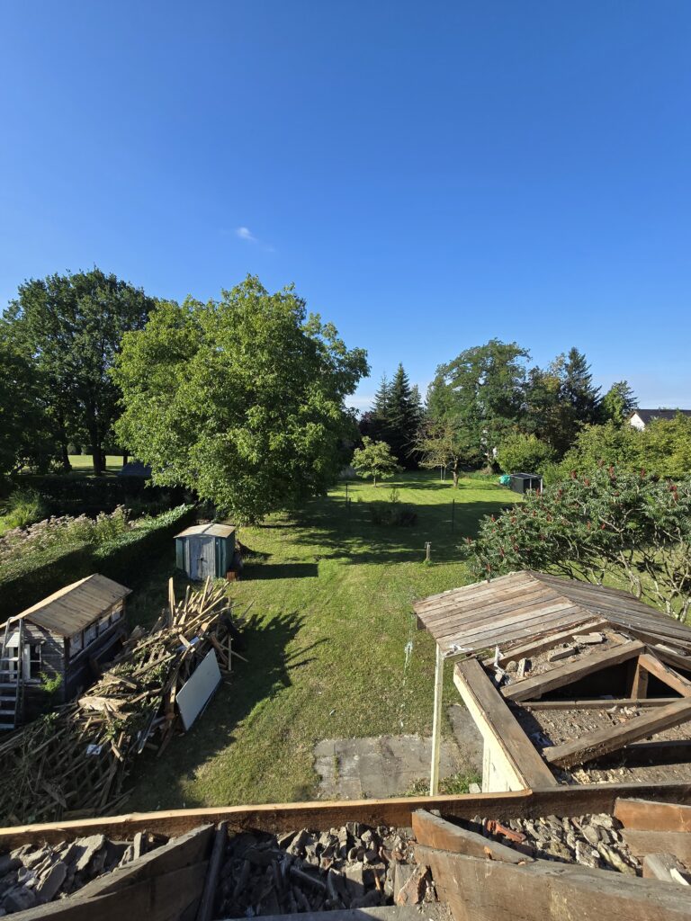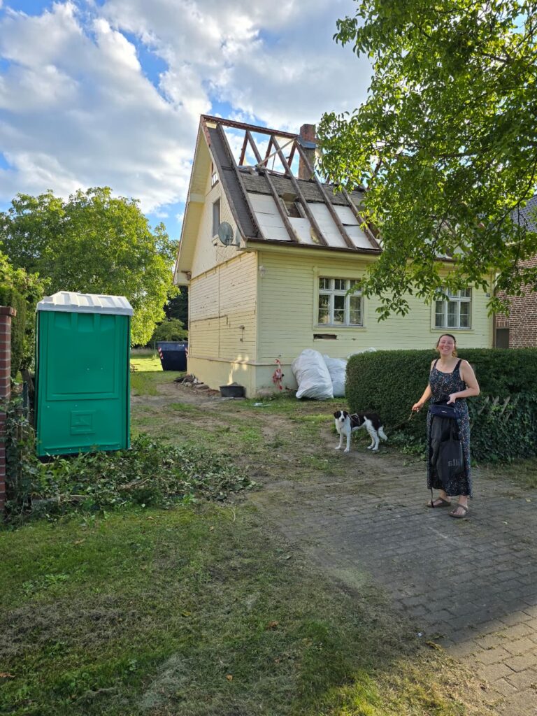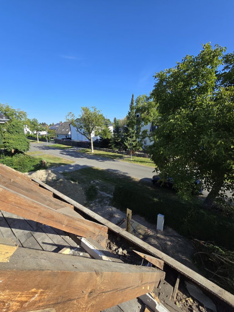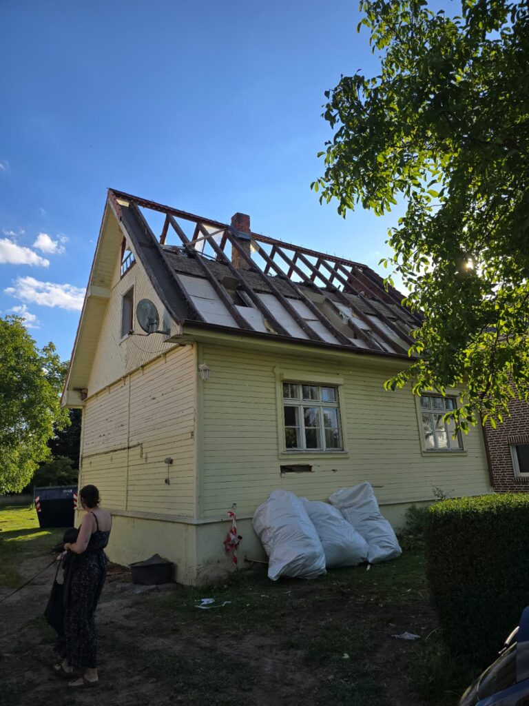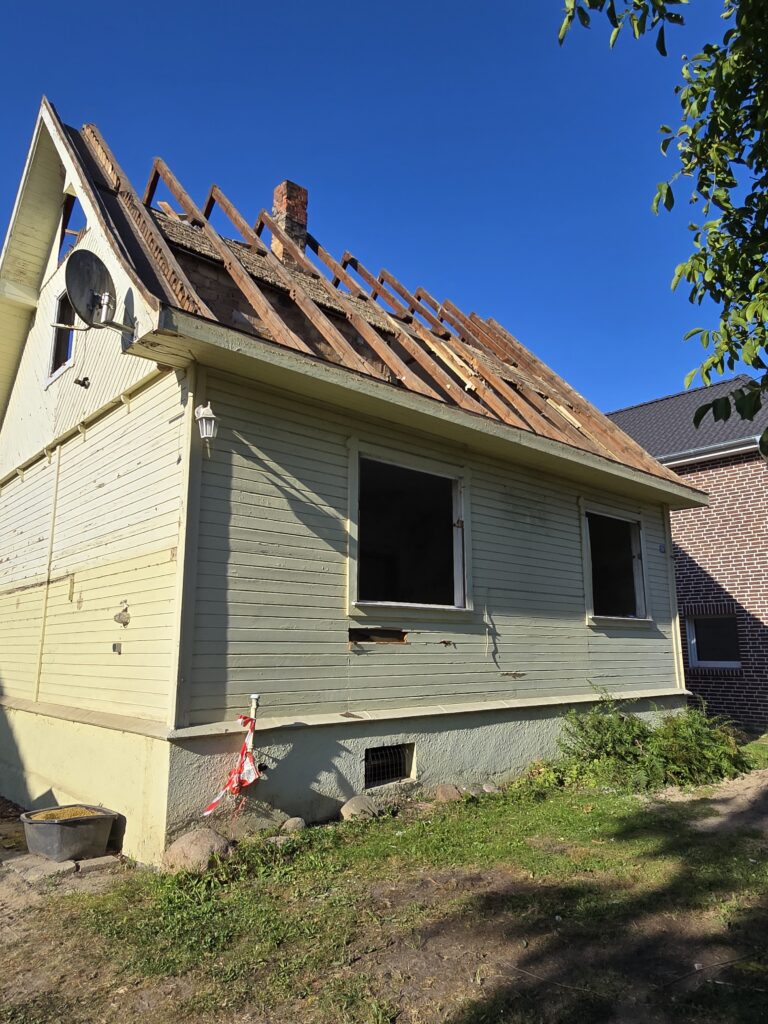Anfang dieser Woche begann endlich der Abriss des alten Fachwerkhaus von 1928. Die ersten Schritte der Abrissarbeiten gingen deutlich schneller als gedacht und so war nach Tag 1 bereits fast das komplette Dach befreit von den Ziegeln.